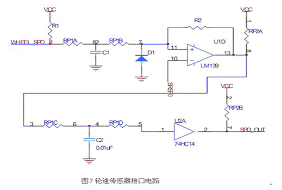 根據前麵部分介紹的輪速傳感器信號特點,設計接口電路如圖7所示。