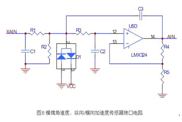 橫擺角速度、縱向/橫向加速度傳感器的安裝位置基本相同,輸出都是0V-5V的模擬量,由於汽車顛簸造成的信號波動特性一致,故封裝在同一模塊中。其硬件接口如圖8所suo示shi,實shi現xian硬ying件jian模mo擬ni前qian置zhi濾lv波bo,以yi抑yi製zhi來lai自zi傳chuan感gan器qi的de模mo擬ni信xin號hao中zhong的de高gao頻pin噪zao聲sheng成cheng分fen,防fang止zhi在zai采cai樣yang過guo程cheng中zhong出chu現xian混hun疊die現xian象xiang。運yun放fang使shi用yong滿man擺bai幅fu輸shu出chu的deLMX324。
