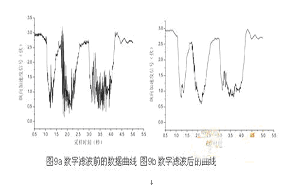 調整圖8中zhong各ge個ge阻zu容rong元yuan件jian的de參can數shu,即ji可ke設she置zhi濾lv波bo截jie止zhi頻pin率lv和he延yan時shi大da小xiao。汽qi車che運yun行xing過guo程cheng中zhong,在zai較jiao好hao路lu麵mian上shang行xing駛shi時shi,由you於yu信xin號hao較jiao好hao,延yan時shi盡jin量liang要yao小xiao,而er在zai顛dian簸bo路lu麵mian上shang行xing駛shi,則ze希xi望wang濾lv波bo效xiao果guo要yao好hao。但dan是shi由you於yu硬ying件jian濾lv波bo的de頻pin率lv特te性xing一yi經jing設she計ji完wan畢bi,無wu法fa實shi時shi修xiu改gai,故gu需xu要yao在zai軟ruan件jian中zhong設she計ji數shu字zi濾lv波bo環huan節jie。數shu字zi濾lv波bo常chang用yong的de有you維wei納na濾lv波bo器qi、卡爾曼濾波器、線性預測器、自適用濾波器等。在這裏選用計算量小、實時性能好的一階低通濾波。