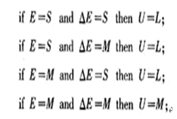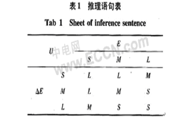 基於神經網絡在推理方麵不足,故借助於模糊控製強大的推理功能,提取有效的條件語句,進而加快網絡的訓練速度。選取偏差E和偏差變化率△E作為輸入和控製量U作為輸出。偏差E和偏差變化率△E的模糊量分別為大(L),中(M),小(S),創立描述條件推理表格如表1。