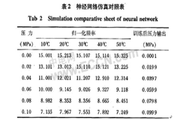 境下進行神經網絡的訓練和仿真,通過神經網絡工具箱,編製相應的仿真訓練程序,實現仿真過程。在仿真時,隨機選取幾組頻率-溫度作為輸入,最後,進行標定壓力值和仿真結果的比較。仿真數據結果如表2。