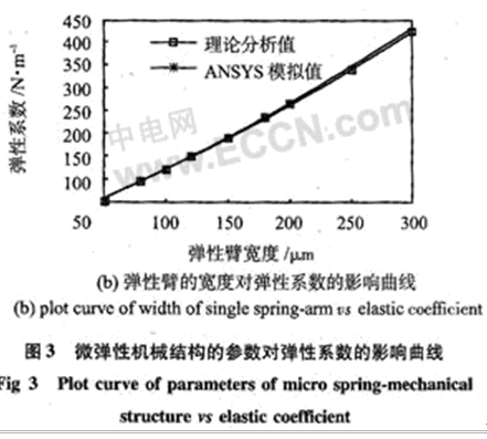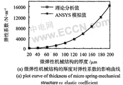 分別用理論方法和ANSYS數值模擬方法得出了在b=200μm時彈性係數k隨微結構厚度h的變化情況,以及在h=50 μm時彈性係數k隨彈性臂寬度b的變化情況,分別如圖3(a),(b)所示。圖3(a)中,2種計算方法求出的彈性係數的平均相對誤差為0.86%,圖3(b)中平均相對誤差為1.06%。可見2種方法計算出來的結果基本吻合。從上述分析可知,在彈簧臂總長確定的情況下,彈簧的彈性係數取決於微結構的厚度h和彈性臂的寬度b,而且,和6的關係近似於線性,因此,可以根據動力學係統的具體要求和加工的工藝性能來選擇合理的h和b,從而滿足傳感器整體性能的要求。