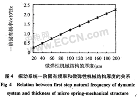 ,m為微結構的當量質量,這裏麵含有每個彈性臂簡化到A點的等效質量,鑒於等效質量求出來誤差較大,僅用有限元模擬工具ANSYS對振動係統進行模態分析。模擬中,取矽的密度為ρ=2330 kg/m3,l3=l4=2000μm參數含義如圖2所示,其餘取上述給定的數值,則振動係統的一階固有頻率為22.37 kHz,在垂直於微結構平麵的方向上振動。同時,模擬出了彈性臂寬度b=200μm時,一階固有頻率f和微結構厚度h的關係圖如圖4所示。可見振動係統的一階固有頻率和微結構的厚度h近似地保持線性的關係。