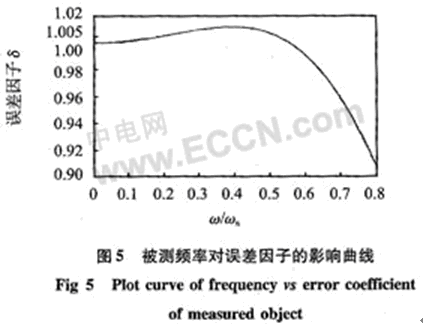 式中a′和a分別為加速度的測得值和真實值。δ和阻尼比ζ與被測物體的頻率ω有關,當ζ=0.65~0.07時,ζ最接近1,因此,取ζ=0.65進行計算機模擬,結果如圖5所示。可以看出:被測頻率比較小的時候測得的加速度值更接近於真實值,當ω/ωn=0.2時,ζ=1.0054,因此,傳感器在設定的頻率範圍1~4.5 kHz的誤差不大於0.54%。