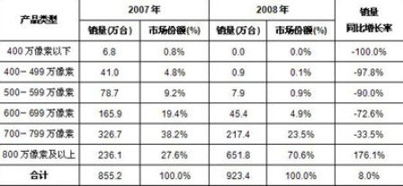 由於技術不斷升級,2008年nian數shu碼ma相xiang機ji的de像xiang素su進jin一yi步bu升sheng級ji。雖sui然ran數shu碼ma相xiang機ji總zong體ti市shi場chang保bao持chi了le較jiao為wei溫wen和he的de增zeng長chang,但dan是shi不bu同tong像xiang素su類lei型xing的de數shu碼ma相xiang機ji增zeng長chang幅fu度du不bu盡jin相xiang同tong。其qi中zhong,800萬像素以上的數碼相機同比2007年有176.1%的增長;而800萬像素以下的所有數碼相機產品都出現了不同程度的下滑。其中400萬像素以下的數碼相機則完全退出市場。