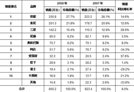 2008年,佳能進一步保持並鞏固其銷售量市場第一的領先地位,市場占比達到27.7%,Sony繼續保持中國數碼相機市場的第二名的位置,在其突出的產品攻勢下,市場份額有所上升。三星、尼康和奧林巴斯,分別進入中國數碼相機市場的前五名。
