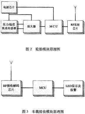 本文設計了一種直接式TPMS,其原理如圖1所示。該係統由兩部分組成,輪胎模塊和車載接收模塊。其中,輪胎模塊包括壓力和溫度傳感器、A/D變換器、控製器及射頻發射器等,如圖2所示。車載接收模塊包括了射頻接收器、控製器以及顯示報警裝置等,如圖3所示。