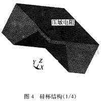 其中,壓阻式壓力傳感器主要是利用半導體的壓阻效應,把一個惠斯通電橋做在一個矽杯上,如圖4所示。當矽杯受到壓力後發生形變,惠斯通電橋的四個橋臂電阻就會發生變化,打破了電平衡,從而會有一個電信號的輸出。