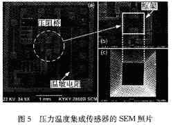 圖5是本文製作的傳感器芯片的電鏡照片。圖5(a)為器件正麵全貌;圖5(b)為薄膜正麵;圖5(c)為薄膜背麵。其中壓敏元件采用比常規更厚的50μm 矽杯薄膜(500 μm×500μm),增zeng大da了le體ti矽gui上shang高gao應ying力li區qu的de麵mian積ji,在zai降jiang低di工gong藝yi要yao求qiu的de同tong時shi提ti高gao了le線xian性xing測ce量liang範fan圍wei和he過guo載zai壓ya力li。壓ya敏min電dian阻zu設she計ji為wei折zhe線xian結jie構gou,采cai用yong優you化hua的de幾ji何he尺chi寸cun,並bing將jiang其qi部bu分fen製zhi作zuo在zai高gao應ying力li體ti矽gui上shang以yi獲huo得de更geng高gao靈ling敏min度du。體ti矽gui上shang的de溫wen敏min電dian阻zu隨sui壓ya敏min電dian阻zu利li用yong同tong步bu注zhu入ru工gong藝yi製zhi作zuo,減jian小xiao了le工gong藝yi複fu雜za度du。該gai器qi件jian工gong藝yi簡jian單dan,成cheng品pin率lv高gao,與yu標biao準zhun IC工藝兼容。