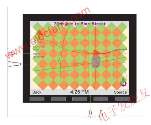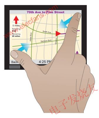 通過比較當前基於電阻式觸摸屏和帶手勢識別的電容式觸摸屏的汽車HMIgainian,womenkeyifaxian,xinzengshoushishibiegongnenghou,jiashirenyuanduilumiandeguanzhuchengduzaimouxiefangmianyousuogaishan。tongguodianrongshichumopingdeshoushishibiebujinshiyizhongxindeshurufangshi,gengshixitongshurutishengdaoleyigexindecengci。caiyongdianrongshichumoping,jiashirenyuanrengrankeyitongguodianjiliulancaidanjiegou,huadongshouzhitigaoyinlianghuozhetiaojieHVAC風扇速(su)度(du)。不(bu)過(guo),真(zhen)正(zheng)重(zhong)要(yao)的(de)是(shi)其(qi)控(kong)製(zhi)標(biao)準(zhun)功(gong)能(neng)的(de)簡(jian)易(yi)度(du),比(bi)如(ru)控(kong)製(zhi)駕(jia)駛(shi)過(guo)程(cheng)中(zhong)非(fei)常(chang)必(bi)要(yao)的(de)導(dao)航(hang)功(gong)能(neng)。用(yong)戶(hu)不(bu)必(bi)緊(jin)盯(ding)著(zhe)屏(ping)幕(mu),隻(zhi)需(xu)一(yi)個(ge)簡(jian)單(dan)的(de)手(shou)勢(shi)即(ji)可(ke)實(shi)現(xian)縮(suo)小(xiao)操(cao)作(zuo)。屏(ping)幕(mu)上(shang)的(de)任(ren)何(he)區(qu)域(yu)都(dou)可(ke)以(yi)感(gan)知(zhi)手(shou)勢(shi),因(yin)此(ci)駕(jia)駛(shi)人(ren)員(yuan)不(bu)必(bi)把(ba)手(shou)指(zhi)放(fang)在(zai)特(te)定(ding)的(de)位(wei)置(zhi)來(lai)完(wan)成(cheng)操(cao)作(zuo)。圖(tu)1顯示就是這種導航屏幕上的動作感知說明。