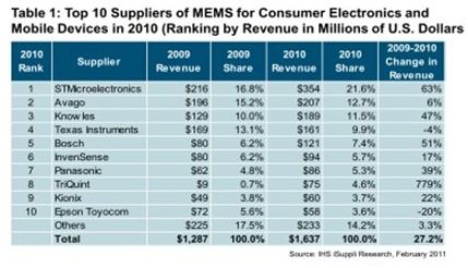 據IHS iSuppli公司的研究,利用在蘋果iPhone 4和iPad中的設計訂單,半導體供應商TriQuint和意法半導體在全球消費電子與手機微機電係統(MEMS)市場取得突出的增長。