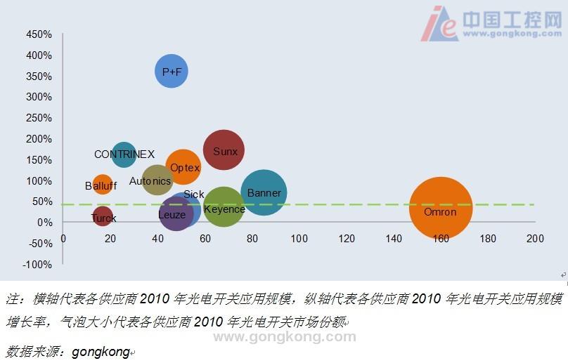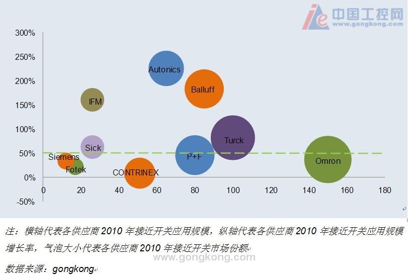 據gongkong《2011年中國離散傳感器市場研究報告》數據顯示,2010年離散傳感器市場迎來高速增長,市場規模達到34.5億人民幣,同比去年增長43.7%,其中光電開關和接近開關的增長幅度都超過了50%,編碼器增長幅度也超過40%,皆為2007年以來的最高水平。