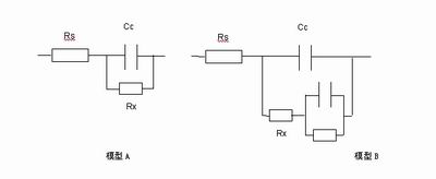 在模型A中電阻器Rs表示金屬所在的溶液,而電容Cc表(biao)示(shi)金(jin)屬(shu)表(biao)麵(mian)的(de)保(bao)護(hu)塗(tu)層(ceng)或(huo)塗(tu)料(liao),這(zhe)表(biao)示(shi)初(chu)始(shi)塗(tu)層(ceng)的(de)電(dian)容(rong)。經(jing)過(guo)一(yi)段(duan)時(shi)間(jian)後(hou),水(shui)滲(shen)入(ru)塗(tu)層(ceng)中(zhong)形(xing)成(cheng)新(xin)的(de)液(ye)體(ti)和(he)金(jin)屬(shu)界(jie)麵(mian)。隨(sui)著(zhe)金(jin)屬(shu)的(de)腐(fu)蝕(shi),通(tong)過(guo)溶(rong)液(ye)與(yu)金(jin)屬(shu)之(zhi)間(jian)的(de)保(bao)護(hu)塗(tu)層(ceng)形(xing)成(cheng)離(li)子(zi)導(dao)電(dian)路(lu)徑(jing)。這(zhe)可(ke)以(yi)用(yong)Rx與Cc並聯模型來表示。另外,有些模型(模型B)還有一個附加的R和C並聯起來再與Rx串聯的電路來表示金屬保護塗層隨著時間變化的分層模型。
