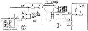 安裝好冷卻液溫度傳感器,將傳感器的連接器插好。當點火開關置於 ON 位置時,測量圖 1 中連接器“ THW ”端子 ( 豐田車 ) 或 ECU 連接器“ THW ”端子與 E2 間輸出電壓。所測得的電壓應與冷卻液溫度成反比變化。