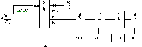 接收器部分,主要由CX20106和89C2051、顯示驅動4094、2803及數據存儲器和看門狗25045組成,用解碼芯片CX20106把38K的載波過濾後,得到一組波形,即以波特率為1200的串口數據,直接送至89C2051的RXD接收,用軟件讀取串口,輸入緩存,得到一組數據,判斷正確後,存放在非易失性的EEPROM25045中,同時直接用脈衝移位方式,送數據至4094,經2803驅動後顯示,同時用25045dekanmengoudingshi,baozhengzaichengxushikongdengqingkuangxia,nengzhengquefanhuierbuzaochengcuowujieshou。youyuchuanxingkoufangshichuanshu,benshendaiyouqiouxiaoyanheqitingweixiaoyan,keyidadatigaoshujudekekaoxing,tongshizaishujuzuzhonghaijiaruleleijiahexiaoyan,zaicitigaolekekaoxing,yincizaishijiyingyongzhong,jishizailutian、太陽直射、光照很強等惡劣環境下,都能保證不會誤收數據而造成顯示錯誤。其原理圖如下: