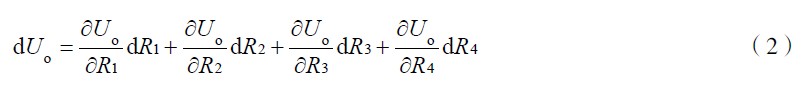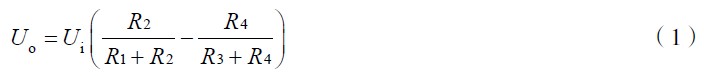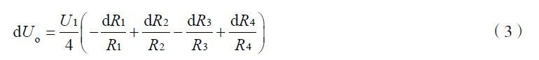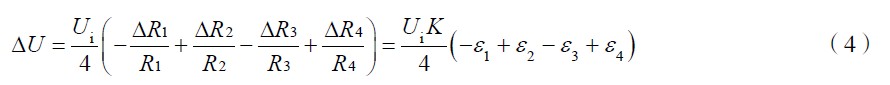 式(4)為電橋轉換原理的一般形式。ΔU 為電橋輸出電壓。作為全等臂電橋, ΔR1 = ΔR2 = ΔR 3= ΔR4 ,式(4)變為ΔU =UKε 。