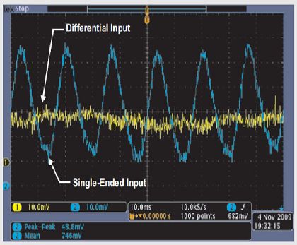 2、電荷放大器是一種非常敏感(高增益)的電路。圖17表明任何輸入幹擾信號的電容耦合(此處為60Hz極板網柵)都會有效注入電流。就單端放大器而言,這意味著端子中的一個注入電流,而其他則接地;也就是說,放大器隻會放大幹擾信號。就差分輸入來說,施加於兩個端子的共模信號會相互抵消(假設寄生和反饋網絡相同)。圖18中,需要注意的是單端輸入(藍色軌跡)60Hz極板網柵的耦合結果,以及60Hz共模噪聲如何被幹擾信號(黃色軌跡)相互抵消的差分輸入極大降低。本例中,為了方便理解,我們並沒有嚐試匹配超出10%組件容限的差動輸入。