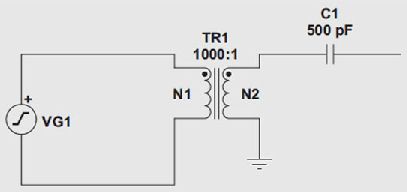 最後,如果這種生成器需要代表實際物理信號,則可以使用變壓器,如圖2所示。本例中,我們建模了一個具有0.5pC/g靈敏度和500pF寄生電容的生成器。正弦波生成器每單位g輸出1V以實現仿真。變壓器在其次級線圈將它向下調節至 1mV.施加給C1(500 pF)的1mV擺動,將會如我們預計的那樣在下一級注入 Q = VC = 0.5 pC.