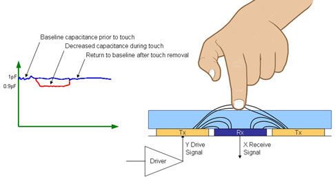 電容感測含有數個層:頂層是玻璃或塑膠材質,接者依序是一個光學透明膠(OCA)層、觸控感測器及平麵液晶顯示器(LCD)。觸控感測器是由許多感測元件所排列而成的網格,尺寸通常為5毫米×5毫米。
