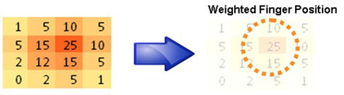 當感測到的電容減去基準值時,就得到一個訊號值陣列,代表圖3所示的手指觸碰狀況。有許多種方法可根據這項資訊來判斷手指的位置,其中最簡單的方法是計算質心--質量中心(Centriod),計算出一維或二維軸向感測數值的加權平均值。運用一維質心計算法,根據上述例子的X軸數據,可算出(5×1+15×2+25×3+10×4)/(5+15+25+10)=150/55= 2.73。接著以液晶螢幕的解析度為標準,將這個位置值適當地縮放,以便和螢幕重疊。若ITO感測器的圖案超出液晶螢幕的邊緣,則必須進行一些轉換計算。