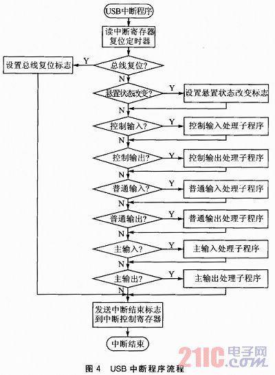 因為C8051F321的USB模塊高度集成化,所以對USB接口的設計主要是USB固件程序的設計。其中最重要的是USB描述符和USB傳輸中斷的處理。當USB中斷到達時,C8051F321首先讀取3個中斷寄存器(CMINT、IN1INT和OUT1INT)來判斷中斷來源(USB複位中斷、端點0中斷、端點1輸入中斷、端點2輸出中斷),然後跳入相應的處理模塊進行處理。USB中斷程序流程如圖4所示。