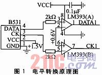 由於容柵傳感器內部的專用控製芯片輸出的信號電壓為1.5 V,而後續數據采集係統工作電壓為5 V,要進行數據交換則必須進行電平轉換,電平轉換原理圖如圖1所示。電路中采用LM393芯片轉換電壓,LM393芯片實質上為2個比較器,比較電壓為容柵傳感器工作電壓的一半左右,設為0.6V。通過比較電壓0.6V與CK和DATA信號線電平比較,即可將CK、DATA信號線的電壓轉換為0V或者5V。