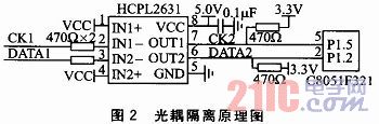 由(you)於(yu)係(xi)統(tong)經(jing)常(chang)工(gong)作(zuo)在(zai)工(gong)業(ye)現(xian)場(chang)等(deng)領(ling)域(yu),各(ge)種(zhong)電(dian)磁(ci)幹(gan)擾(rao)很(hen)常(chang)見(jian),為(wei)了(le)使(shi)係(xi)統(tong)能(neng)穩(wen)定(ding)工(gong)作(zuo),采(cai)用(yong)光(guang)耦(ou)隔(ge)離(li)技(ji)術(shu)將(jiang)傳(chuan)感(gan)器(qi)和(he)單(dan)片(pian)機(ji)隔(ge)離(li)。光(guang)耦(ou)隔(ge)離(li)原(yuan)理(li)圖(tu)如(ru)圖(tu)2所示。光耦器件采用HCPL2631高速光耦,輸出引腳OUT1和OUT2經過上拉電阻處理後,將CK2和DATA2信號傳輸給C8051F321單片機處理。