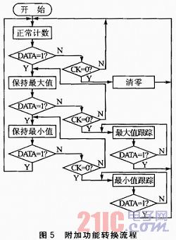 附加功能子程序包括正常計數、數據保持、最大值跟蹤、最小值跟蹤和清零的功能。對附加功能的實現均是通過控製CK和DATA信號線完成,附加功能轉換流程如圖5所示。給CK信號線一個負脈衝,即可完成清零操作;在正常計數狀態下將DATA信號線置為高電平,容柵傳感器將進入保數功能;如果再將CK信號線置為低電平,容柵傳感器進入最大值跟蹤功能;內部專用芯片將用新測得的數據與上一個數據進行比較,如果新測得數據大,則替換掉,否則丟棄。可以在上位機上通過USBceshiruanjianfasongxiangguanminglinglaikongzhixitongjinxingcaozuo。chengxuzhongshedingyigezijiedebianlianglaicunfangcongshangweijijieshoudaodemingling,dangpanduanshiqizhongdeyigeminglingshijiutiaoyongxiangyingdechulichengxuwanchengcaozuo。