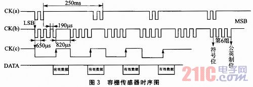 容柵傳感器時序圖如圖3所示。其中包含3個CK信號說明和1個DATA信號說明。CK(a)表示要發送的完整數據間的時序關係;CK(b)表示一個完整數據內部各個數據組的時序關係;CK(c)和DATA表示一個數據組內的時序關係和對采樣點的說明。由圖可知數據每隔250 ms發送一次,在時鍾CK的上升沿數據有效。數據由LSB到MSB依次發送,總共24位二進製數據,分成6組,每組數據間隔820μs。其中前5組為數據位,第6組為控製位組(包含符號位和公英製位),控製位組的第0位的“0”表示正數,“1”表示負數,第3位“0”表示公製單位mm,最小單位0.01 mm,“1”表示英製單位inch,最小單位0.000 5 inch,x表示無效。為了能夠實時采集數據,采用中斷方式檢測CK信號,邊沿觸發。檢測CK信號的高電平持續超過820μs時,當出現下降沿時觸發中斷,進入中斷程序,再持續檢測低電平直到出現上升沿,讀取DATA信號電平並存儲,總共采集24位。返回主函數根據符號位和公英製位進行相應處理。相關程序代碼如下: