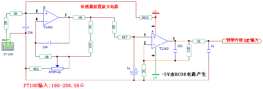 單片機的 10 位 A/D 在滿度量程下,最大顯示為 1023 字,為了得到 PT100 傳感器輸出電壓在顯示 500 字時的單片機 A/D 轉換輸入電壓,必須對傳感器的原始輸出電壓進行放大,計算公式為:(500/1023 * Vcc)/傳感器兩端電壓( mV/℃ ) ,(Vcc=係統供電=5V),可以得到放大倍數為 10.466 。