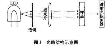 係xi統tong要yao求qiu光guang電dian傳chuan感gan探tan測ce部bu分fen具ju有you較jiao高gao的de檢jian測ce精jing度du和he穩wen定ding性xing,且qie實shi時shi性xing高gao,即ji需xu要yao對dui待dai測ce海hai水shui進jin行xing連lian續xu不bu間jian斷duan的de在zai線xian測ce量liang,因yin此ci采cai用yong近jin紅hong外waiLED作(zuo)為(wei)光(guang)源(yuan)。光(guang)源(yuan)發(fa)出(chu)的(de)近(jin)紅(hong)外(wai)光(guang)經(jing)過(guo)光(guang)學(xue)鏡(jing)組(zu)選(xuan)擇(ze)得(de)到(dao)對(dui)溢(yi)油(you)具(ju)有(you)特(te)征(zheng)吸(xi)收(shou)的(de)分(fen)析(xi)光(guang),經(jing)透(tou)射(she)與(yu)樣(yang)品(pin)室(shi)的(de)樣(yang)品(pin)發(fa)生(sheng)相(xiang)互(hu)作(zuo)用(yong),然(ran)後(hou)進(jin)入(ru)光(guang)電(dian)探(tan)測(ce)器(qi),將(jiang)光(guang)信(xin)號(hao)轉(zhuan)換(huan)為(wei)電(dian)信(xin)號(hao),從(cong)而(er)實(shi)現(xian)對(dui)樣(yang)品(pin)成(cheng)分(fen)的(de)檢(jian)測(ce)見(jian)圖(tu)1所示。