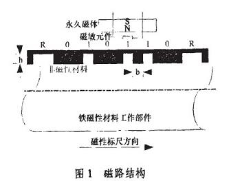 采用圖1suoshideceliangjiegou,qizhongbeicegongzuobujianyaoqiushuyutiecixingcailiao。wenxianzhongzhichuzaigudingdecichangzhong,biaomianbianhuadequlvyueda,yinqidezhouweicichang,bianhuayeyueda。weileshicichangdeyingxiangzuida,xuanyongaocaozuoweicezhaobiaozhi,yidanweikuandu(bmm)的凹槽表示“0”或碼元間隔,單能寬度的“凸槽”表示“1”,兩倍單位寬度的“凸槽”表示標誌位R。在工作部件表麵,按上述的編碼規則加下出一係列凹槽,然後噴塗上非磁性材料,形成磁性標尺。圖1所示的磁性標尺表示Gray碼01 1010碼區,黑色部分表示非磁性材料。