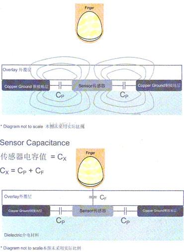 那麼,電容式感應的工作原埋是什麼呢?下麵的示意圖顯示了1個電容式感應按鈕的橫截麵。如圖所示,在外覆層材料之下,存在導電的銅塊區域和導電的傳感器。在2個導電元件相互之間靠得很近時,就會產生一個電容值,本圖中標為Cp,這個電容值是由於傳感器墊板與接地板之間的耦合現象而形成的。Cp屬於寄生電容,典型數量級任10pF至300pF。傳chuan感gan器qi與yu接jie地di板ban靠kao近jin時shi也ye會hui形xing成cheng一yi個ge邊bian緣yuan電dian場chang,這zhe個ge電dian場chang能neng夠gou穿chuan透tou外wai覆fu層ceng。基ji本ben上shang,人ren體ti組zu織zhi也ye屬shu於yu導dao電dian體ti。將jiang一yi根gen手shou指zhi放fang存cun邊bian緣yuan電dian場chang附fu近jin時shi,就jiu會hui增zeng加jia這zhe個ge電dian容rong係xi統tong的de導dao電dian表biao麵mian麵mian積ji。