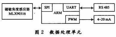 數據處理單元由磁敏角度感應器、微處理器單元、通信接口以及輸出模塊,具體的功能框如圖2所示。