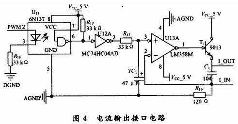 數據處理單元具備一路可控4~20 mA的電流輸出,用於現場指示儀表的驅動。具體的連接電路如圖4所示。其中PWM2連接ARM的PWM2引腳,PWM信號用於控製光耦的導通與截止,反相器主要用於波形的整定,根據磁敏角度和位移關係,建立數學模型,計算出PWM的占空比,從而達到電流大小調節的目的。