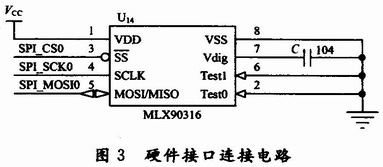 由於串行通信的輸出信號直接來自於MLX90316的內部DSP輸出,SPI輸出模式更穩定,誤差更小,並且具有更高的抗幹擾能力。在本設計中,選用SPI接口,具體的硬件接口連接電路如圖3所示。在圖3中,MLX90316的SPI三根線與ARM LPC2136的SPl0口連接。SPI(SerialProtocol InterIace)總線接口是一種同步串行外設接口。這是一個4根信號線的串行接口協議,包括主、從兩種模式。這4根信號線分別是:時鍾線(SCK)、數據輸入線(MISO)、數據輸出線(MOSI)和從設備使能線(SS)。