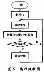 軟件編程主要包含3個模塊:PWM控製電流輸出模塊、RS 485通信模塊、MLX90316的SPI通信模塊,編程流程如圖5所示。PWM控製電流輸出模塊主要通過改變PWM的占空比來調節電流的大小。RS 485通信模塊主要用來接收上層係統的指令並根據指令將數據回傳。MLX90316的SPI通信模塊主要用於磁敏角度的讀取,SPI的通訊過程為:主控端先輸出1個0xAA以及1個0xFF作為通信起始信號,然後接著輸出8個0xFF,而從端會同時輸出2個0xFF、4個字節的角度信號以及4個0xFF,從而完成一次數據通訊。