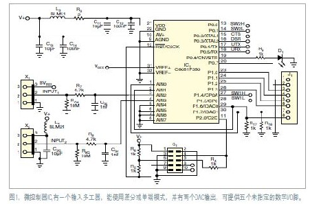 本設計中的電路包括一個混合信號微控製器、一隻USBUART(通用異步接收器/發射器),還有一個新穎的自適應模擬傳感器輸入電路。此電路可以將多種類型的傳感器接到設計的兩個模擬輸入通道上,在一個USB主機上控製這些設備,讀出測量數據。USB連接為電路提供電源。在計算機上就能用簡單指令控製設備;甚至用終端軟件也可以做測量工作。8051核有免費的工具, 便於做編程工作, 如IDE(集成開發環境)、調試器以及C編譯器。