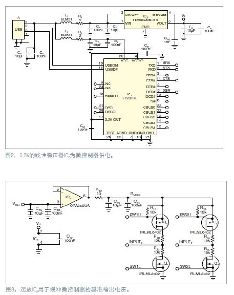 3.3V的線性穩壓器IC2為微控製器供電(圖2)。從USB端口通過磁珠與濾波器,就可以直接為USB芯片IC1供電。這款芯片是常見而可靠的USBUART芯片,可與使用任何操作係統的計算機通信。運放IC4用作微控製器基準輸出的緩衝(圖3)。