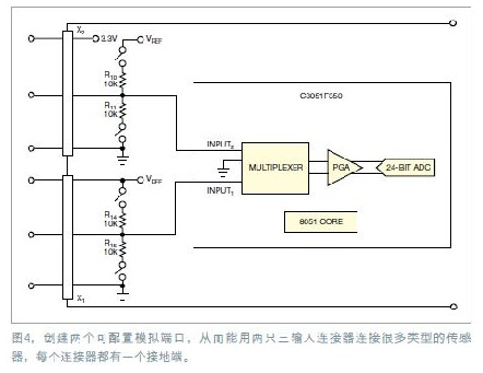 使用兩隻三輸入連接器,就可以將很多類型傳感器連接到兩個可配置模擬端口上,每隻連接器都有一個接地端(圖4)。一個接地端提供3.3V電源,其它則輸出經緩衝的基準電壓,其額定值為2.5V.lianggelianjieqidezhongjianyinjiaojiedaoweikongzhiqidemonishuruduogongqishang。zheyang,jikeyicelianglianggedanduandianya,yekeyijiangliangzhilianjieqiyongzuochafenshuru。lianggeshuruduanjunyouduliqiehuandeshanglayuxialadianzuR10、R11、R14與R15.