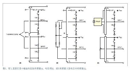 高分辨率ADC與PGA可以直接連接熱電偶(圖6)。通過切換一個通道上的上拉電阻和下拉電阻,就可以實現所需的偏置點。關掉所有內置電阻,就可以采用直接連接的橋式傳感器(如測壓元件和壓力傳感器)。這些情況下,應使ADC工作在差分模式。讓所有開關開路亦適合於采用電位器輸入或IC 傳感器的場合,如SS49E霍爾效應磁場傳感器。