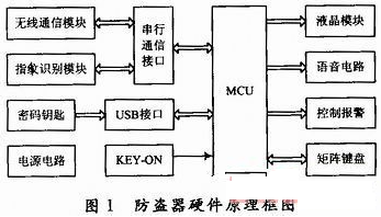 主要工作原理如下:車主停車熄火後,防盜器進入鎖定狀態。此時如果汽車鑰匙不在ON位,就不能進行指紋識別;隻有當汽車鑰匙在ON位,才可用指紋識別解鎖防盜器並自動點火。在鎖定狀態下,汽車的油路、電路等被切斷,汽車鑰匙無法點火;如果強行剪斷指紋采集模塊和控製盒的連線,或者不識別指紋而強行用汽車鑰匙點火,汽車會通過鳴號、閃燈和無線通信網絡報警。在鎖定狀態插入密碼鑰匙可進入解鎖狀態,並可根據LCD和語音提示通過小鍵盤進行指紋注冊/刪除、手機號碼設置和應急點火等操作。