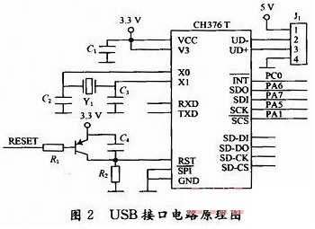 USB接口電路主要由文件管理控製芯片CH376T實現,CH376T支持USB設備方式和USB主機方式,並且內置了USB通信協議的基本固件、處理MassStorage海量存儲設備的專用通信協議的固件、SD卡的通信接口固件、FAT16和FAT32以及FAT12文件係統的管理固件,支持常用的USB存儲設備和SD卡。CH376T支持二種通信接口:SPI接口和異步串口。本設計采用SPI接口與MCU進行數據通信,電路連接方式如圖2所示。串行數據輸入SDI、輸出SDO和時鍾SCK分別接STM32F103VC的SPI1_MOSI,SPI1_MISO和SPI1_SCK,中斷請求輸出端INT接PC0,片選端SCS由PA1控製。圖2中的RESET是係統複位信號,晶體振蕩器Y1選12 MHz。當車主要進行指紋注冊/刪除或應急點火時,將密碼鑰匙(U盤)接入J1以讀取密碼信息。