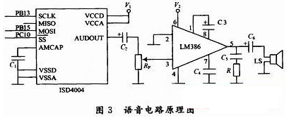 語音電路原理圖如圖3所示,由美國ISD公司的語音芯片ISD4004-16和美國國家半導體公司的音頻功率放大器LM386等元件構成。ISD4004 -16錄放時間為16 min(可分段),它采用CMOS技術,單電源3 V工作,內含振蕩器、抗混疊濾波器、平滑濾波器、音頻放大器、自動靜噪及高密度多電平閃爍存貯陳列。它內置微控製器SPI總線串行通信接口。可將模擬語音數據直接寫入單個存儲單元,不需通過A/D或D/A轉換。使得ISD語音電路具有音質自然、使用方便、單片存儲、反複錄放、低功耗、抗斷電等許多優點。LM386工作電壓範圍寬,電壓增益可調。具有自身功耗低、電壓增益可調整電源電壓範圍大、外接元件少和總諧波失真小等特點。本設計中STM32F103VC通過SPI2給ISD4004傳送語音信息。圖3中的V1和V2分別經三極管與+3.3 V和+12 V電源相連,三極管的通斷由STM32F103VC的PCI1和PCI2控製,隻有在需要語音提示時,才使三極管導通給ISD4004和LM386供電。