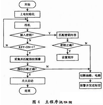 在鎖定狀態,車主要進行指紋注冊/刪除或應急點火時,接入密碼鑰匙,通過鍵盤操作STM32F103VC在其PA1產生CH376T芯片的SPI片選信號,低電平有效,然後按SPI輸出方式發出一個字節的數據,延時1.5μs,從CH376T接收一個字節的數據,等待SPI接口空閑後,MCU繼續從CH376T接收數據,直到MCU禁止SPI片選。接下來對讀取的數據進行密碼匹配,密碼匹配正確時可進入設置狀態,車主可根據語音和LCD提(ti)示(shi)進(jin)行(xing)操(cao)作(zuo),操(cao)作(zuo)結(jie)束(shu)便(bian)返(fan)回(hui)鎖(suo)定(ding)狀(zhuang)態(tai)。如(ru)果(guo)密(mi)碼(ma)匹(pi)配(pei)不(bu)正(zheng)確(que)將(jiang)發(fa)出(chu)相(xiang)應(ying)報(bao)警(jing)信(xin)號(hao)並(bing)切(qie)斷(duan)電(dian)路(lu)和(he)油(you)路(lu)。如(ru)果(guo)不(bu)進(jin)行(xing)設(she)置(zhi),當(dang)插(cha)入(ru)汽(qi)車(che)鑰(yao)匙(chi)並(bing)打(da)至(zhi)“ON”位,可進行指紋采集和匹配,匹配正確可自動點火(點火失敗時可用車鑰匙再次點火),如果指紋匹配不正確,發出相應報警並保持電路和油路為斷開狀態。