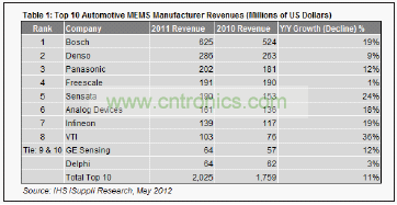 去年10大廠商合計占有91%的市場份額。2011年整體汽車MEMS傳感器營業收入為22.4億美元,比2010年的19.6億美元增長14%。盡jin管guan去qu年nian日ri本ben和he泰tai國guo發fa生sheng自zi然ran災zai害hai,但dan該gai產chan業ye仍reng然ran實shi現xian增zeng長chang,而er且qie未wei來lai兩liang年nian的de增zeng長chang將jiang得de到dao政zheng府fu相xiang關guan命ming令ling的de有you力li推tui動dong,比bi如ru美mei國guo和he歐ou洲zhou國guo家jia政zheng府fu要yao求qiu采cai用yong電dian子zi穩wen定ding控kong製zhi(ESC)和輪胎壓力監測係統。