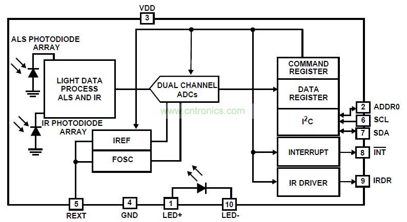ISL29043是一款帶有I2C(兼容SMBus)接口的集成紅外LED的環境光和接近檢測三合一數字輸出傳感器。該芯片內部集成兩個獨立的ADC,並行進行環境光和接近檢測。靈活的中斷設置可盡可能少的占用微控製器上的資源。