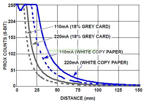 對於接近傳感器(Prox)數據轉換,內置驅動器控製內部紅外LED發出紅外光,用於接近傳感器的ADC將反射的紅外光強度轉換為數字信號。該ADC可消除周圍環境光中的紅外光幹擾(如太陽光),其轉換時間為540μs。