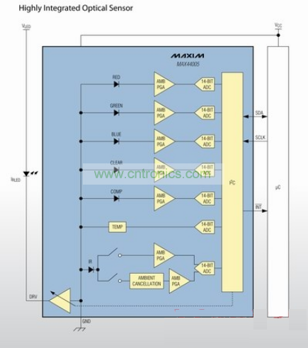 · MAX44005包含RGB傳感器、ALS傳感器、IR傳感器、IR接近檢測傳感器和溫度傳感器。