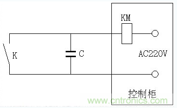 有時PLC或其它控製器的開關量輸入由於受外界幹擾影響而瞬間輸入錯誤,導致PLC產生誤動作,這時在PLC的輸入端並上一個0.1uF的小電容就可以消除這種幹擾,如下圖所示: